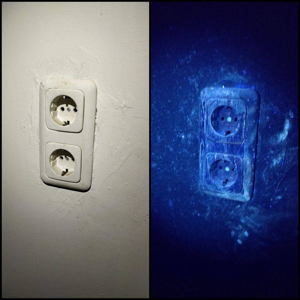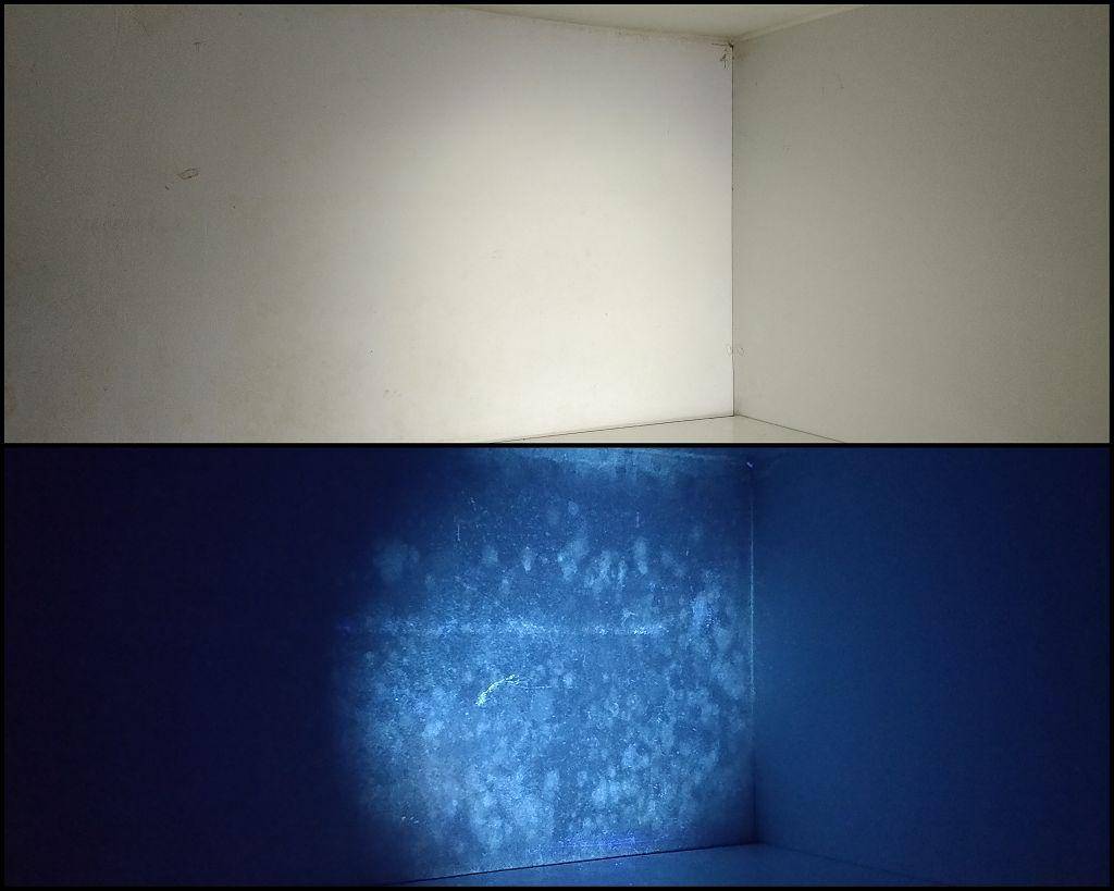 Hier sehen Sie erneut eine Gipskartonvorsatzschale vor einer feuchten Kellerwand. Ohne Forensik ist keine Pilzbildung erkennbar, aber mit UV-Licht werden unpigmentierte Pilzkolonien sichtbar.